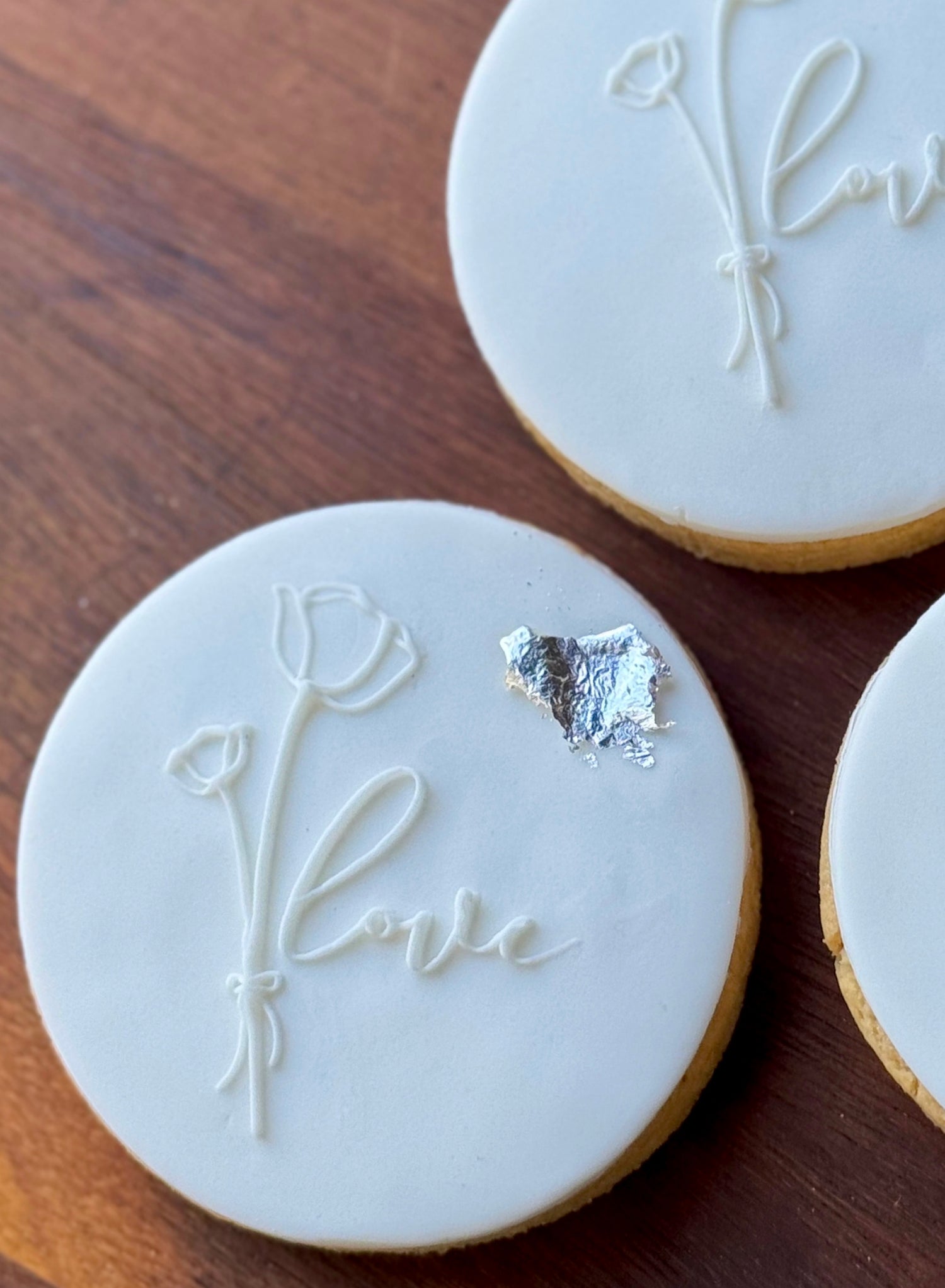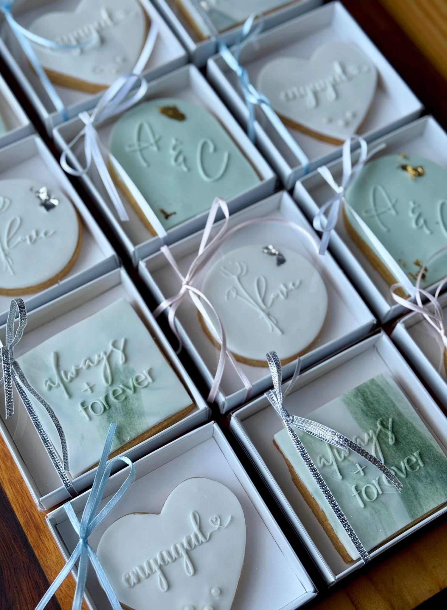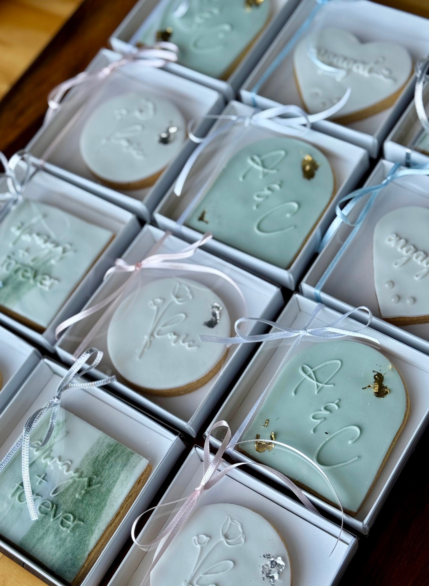 Cookies will be individually sealed and boxed in a 10cm square white box with a clear lid and tied with a bow of your colour choice