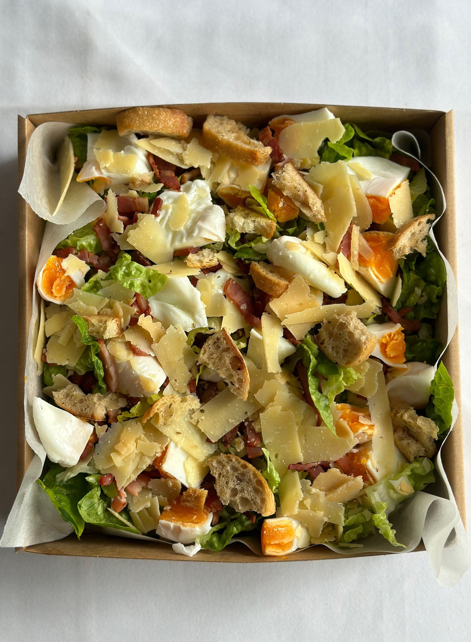 Cos lettuce, parmesan, bacon, poached eggs, croutons and dressing... no anchovies (750g-1kg)