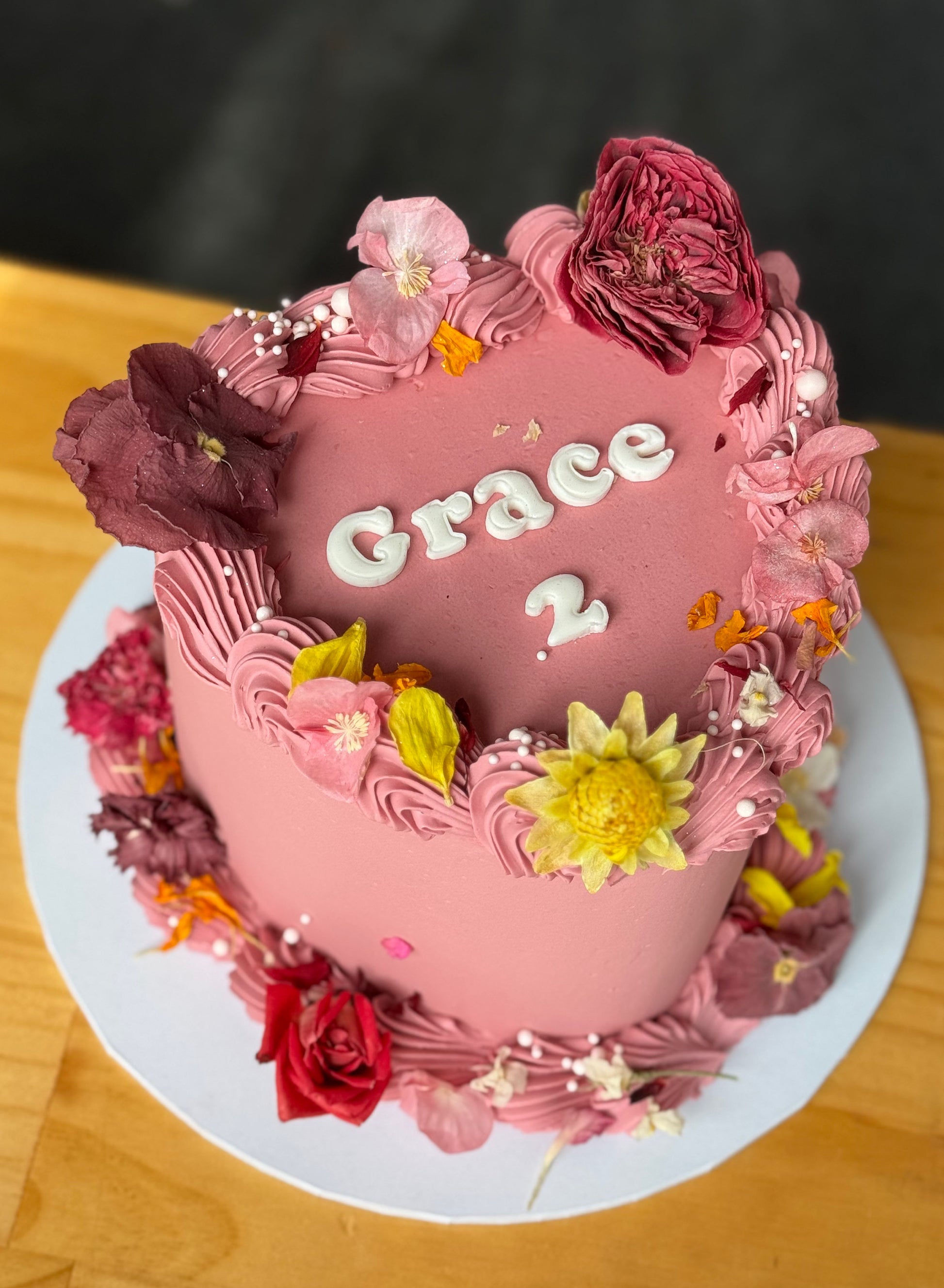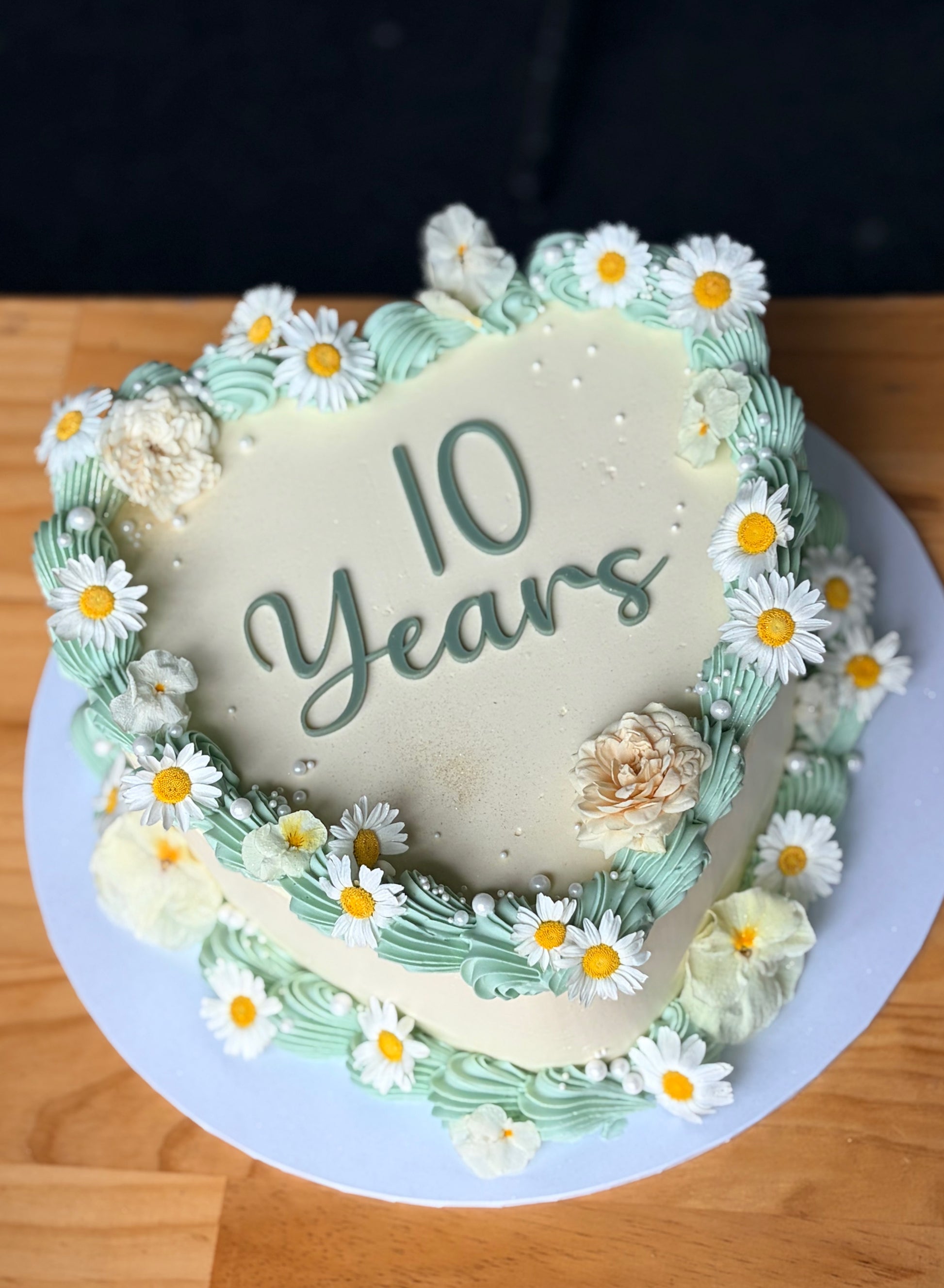 Heart shaped retro style cake with a custom message and dried edible flowers/pearls