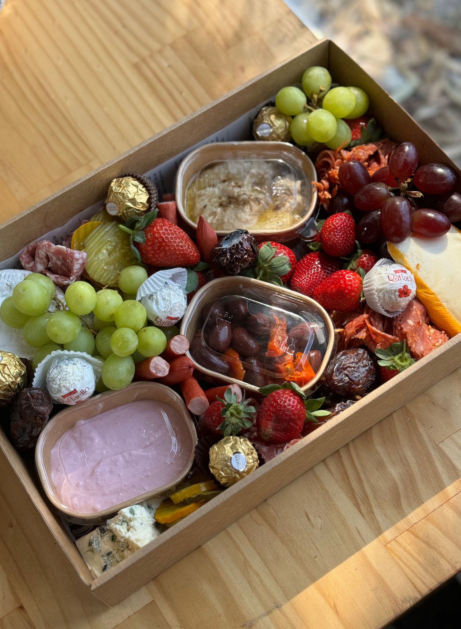 Loaded with cheeses, dips, charcuterie, fruit, antipasto, biscuits and more