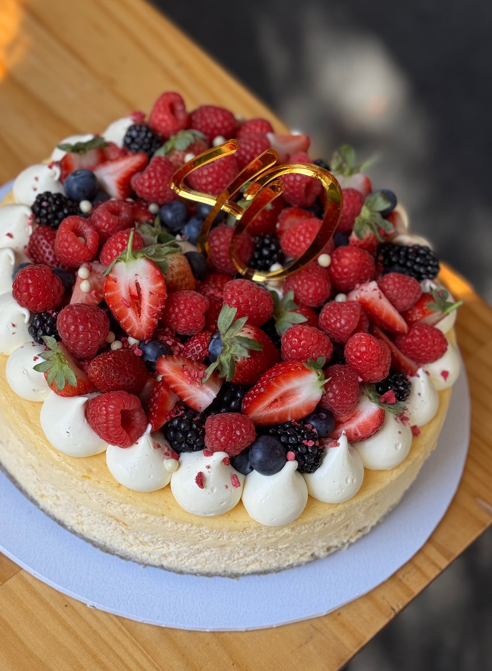 Classic baked sour cream cheesecake with a tangy lemon zing, whipped white chocolate ganache and fresh fruits