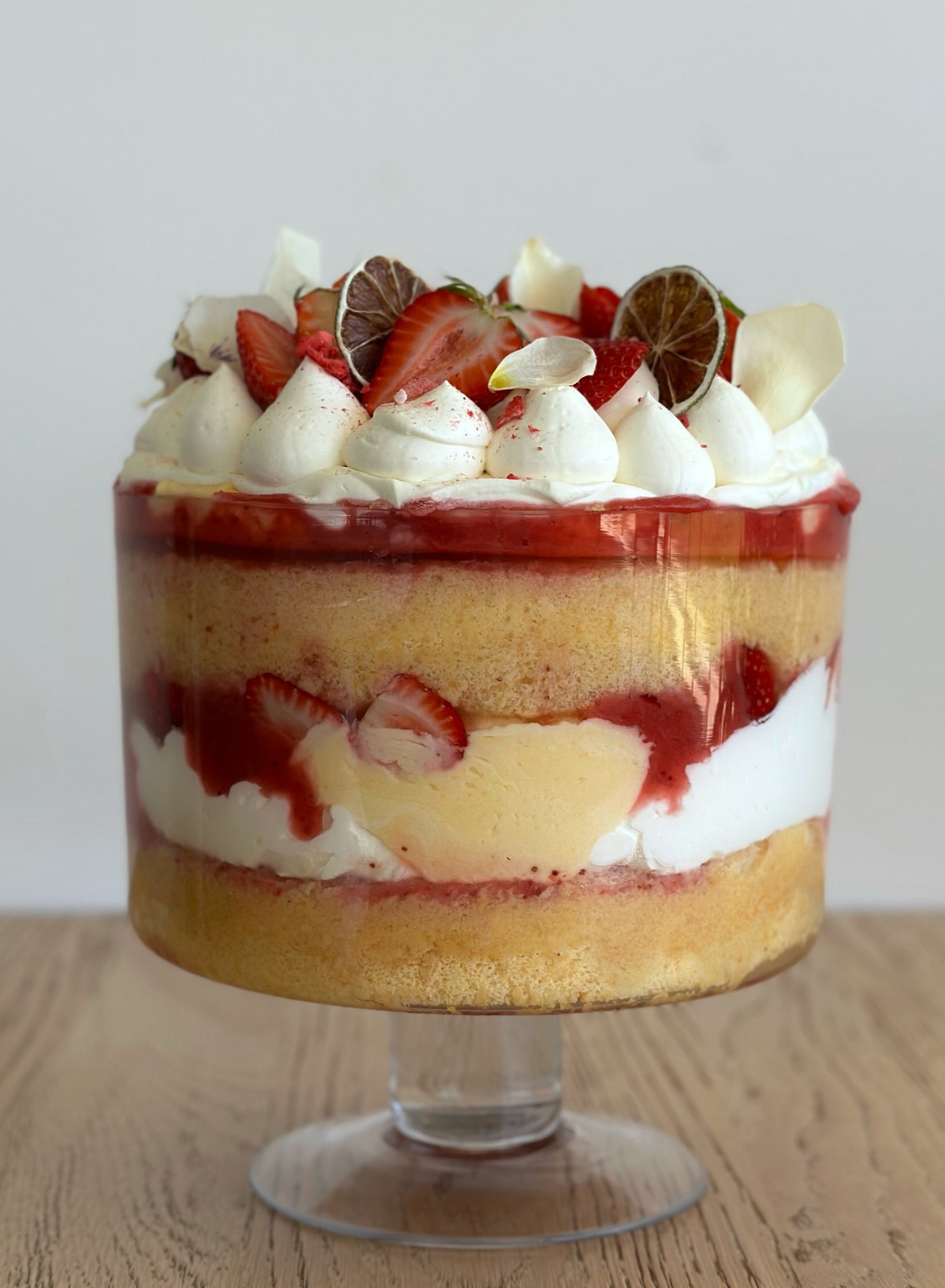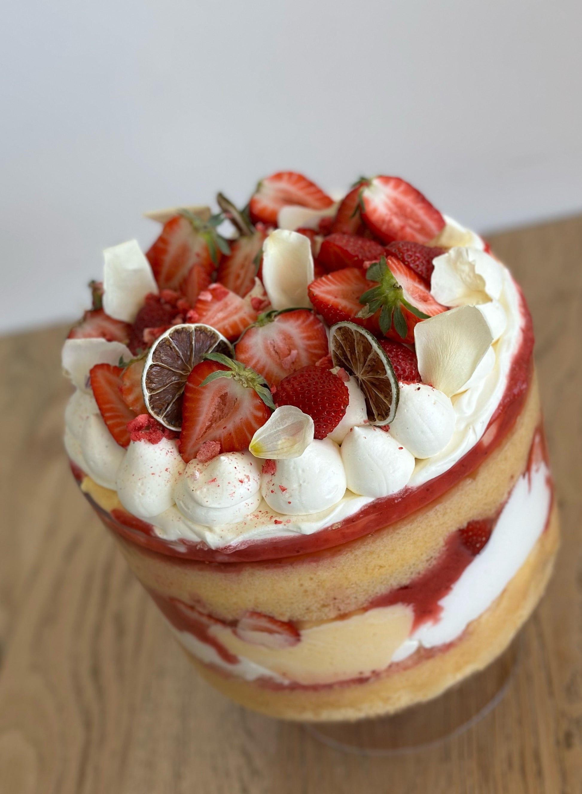Coconut Victoria sponge, gin and strawberry soak, yuzu and gin jelly, yuzu diplomat creme, strawberry compote, creme fraiche Chantilly, coconut flakes, lime, fresh raspberries and strawberries
